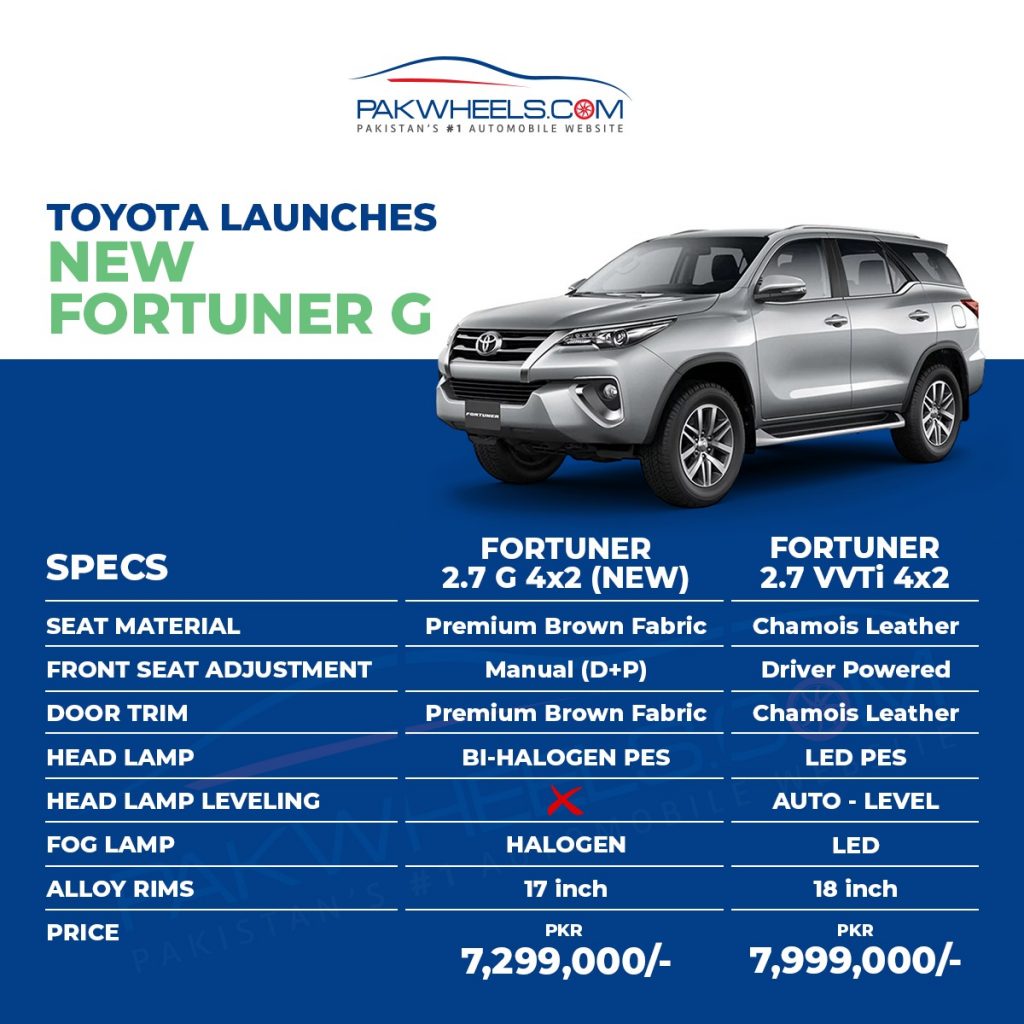 The Fortuner G can be considered as the fundamental reason for the Fortuner in light of the fact that it has fewer highlights and is lower than current costs. It is additionally furnished with various highlights that are very not quite the same as the current 2.7-liter Fortuner VVTI. The Fortuner G set is accessible in premium darker texture Material and Door Term, while it arrives in a 2.7-liter assortment dependent on calfskin from the Fortuner stream. Essentially, it likewise has a manual seat modification for the front driver and traveler. 2.7 In VVTi, the driver’s seat modification is executed. Incandescent lights are accessible in Fortuner GK headlights and haze lights, while 2.7 VVTI has LED headlights. The Fortuner GK headlights don’t have a programmed leveling capacity, which was available. Likewise, it has 17-inch combination wheels rather than 18-inch wheels, which are accessible in 2.7 VVTi.